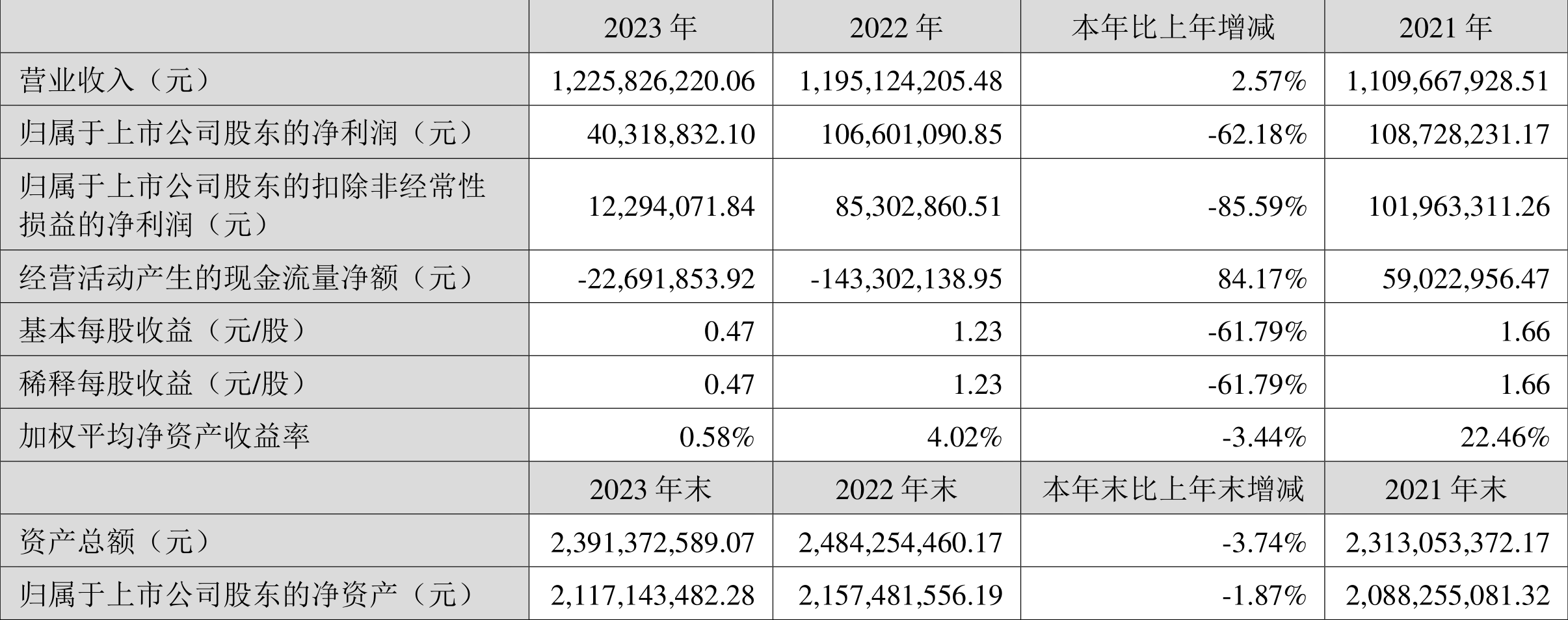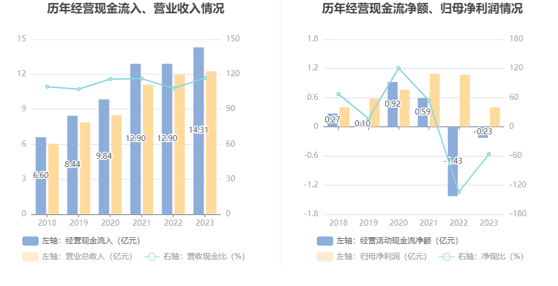 2023年,公司筹画行径现款流净额为-2269.19万元,同比增多1.21亿元;筹资行径现款流净额-1.68亿元,同比减少1.87亿元;投资行径现款流净额-1.50亿元,上年同时为-10.18亿元。