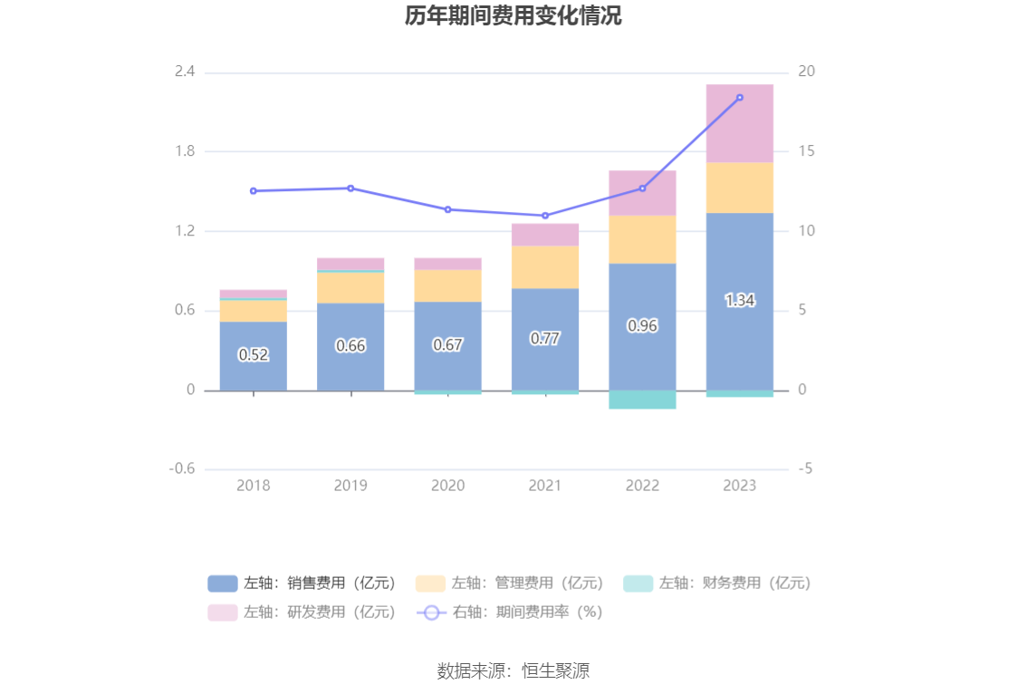 2023年,公司时代用度为2.26亿元,较上年同时增多7404.61万元;时代用度率为18.43%,较上年同时飞腾5.72个百分点。其中,销售用度同比增长39.42%,处理用度同比增长5.67%,研发用度同比增长70.52%,财务用度由旧年同时的-1440.11万元变为-450.16万元。