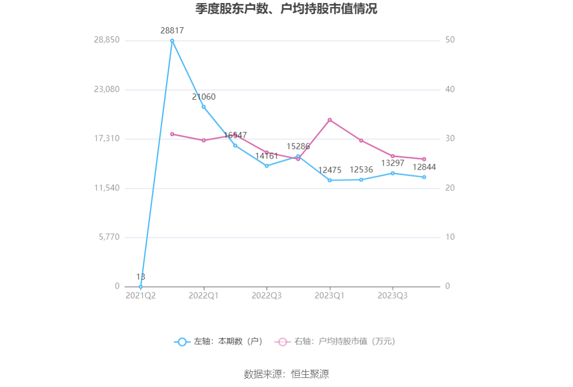 筹码聚首度方面,终局2023年年末,公司鼓动总户数为1.28万户,较三季度末下跌了453户,降幅3.41%;户均捏股市值由三季度末的26.53万元下跌至25.92万元,降幅为2.30%。