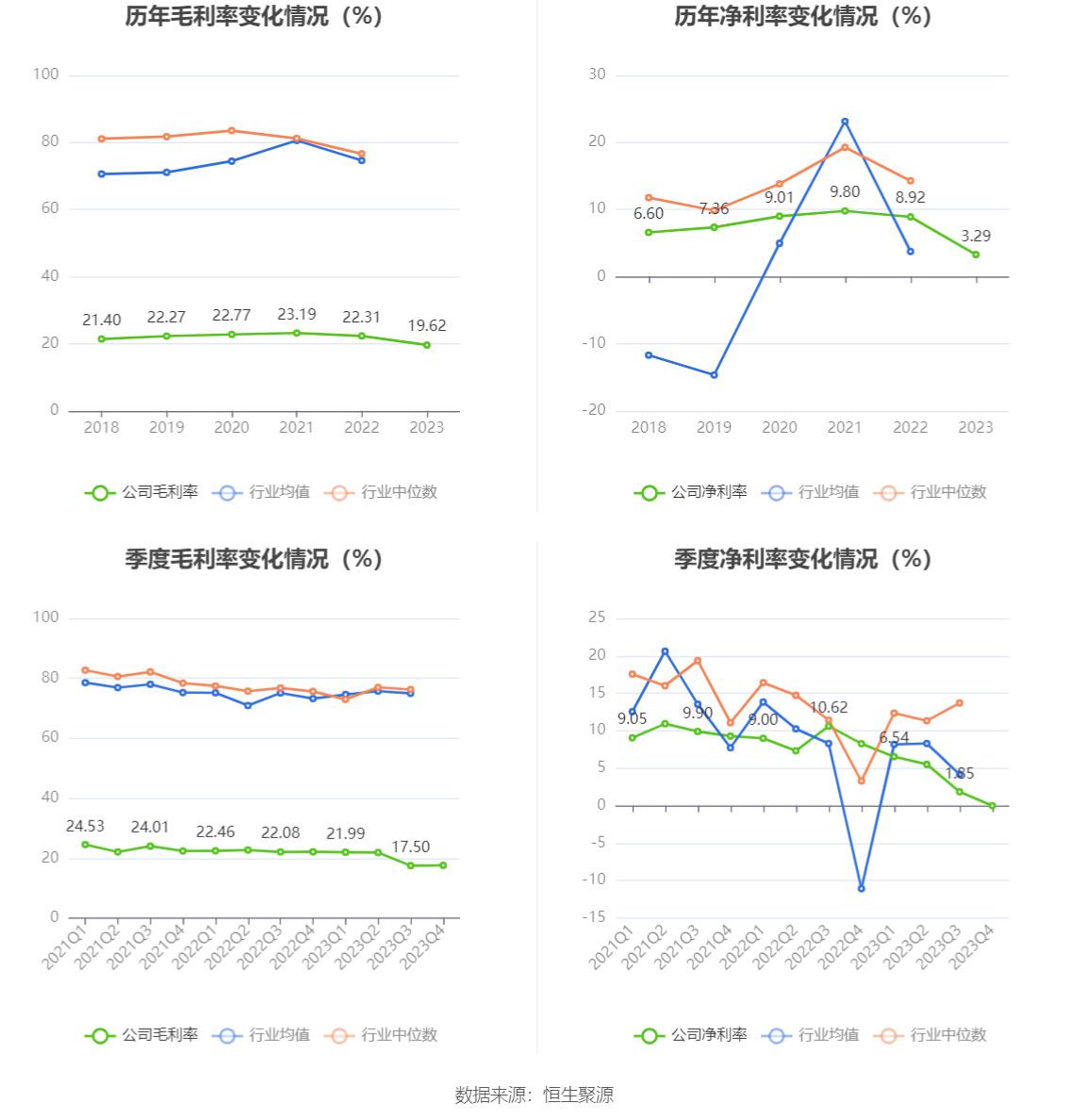 2023年,公司毛利率为19.62%,同比下跌2.69个百分点;净利率为3.29%,较上年同时下跌5.63个百分点。从单季度目标来看,2023年第四季度公司毛利率为17.63%,同比下跌4.49个百分点,环比飞腾0.13个百分点;净利率为0.01%,较上年同时下跌8.27个百分点,较上一季度下跌1.84个百分点。