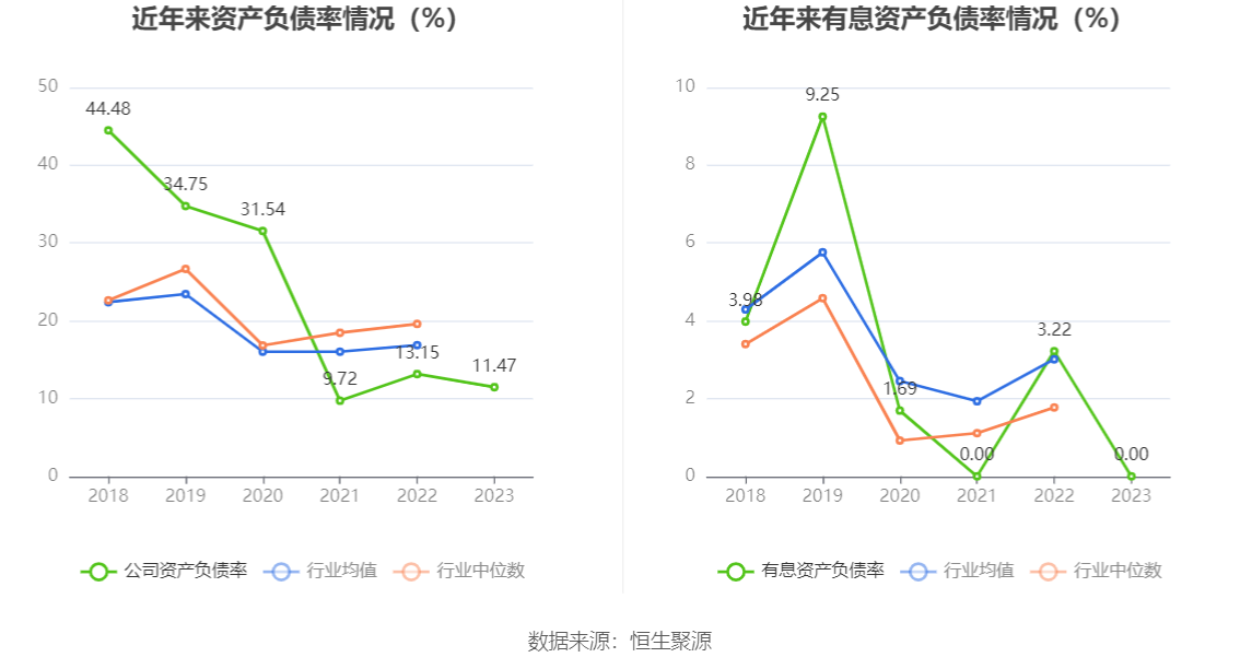 在偿债身手方面,公司2023年年末财富欠债率为11.47%,比拟上年末下跌1.68个百分点;有息财富欠债率为0.00%,比拟上年末下跌3.22个百分点。