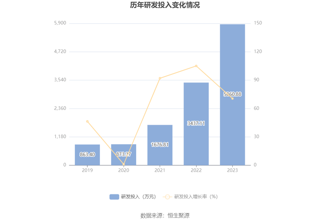 2023年全年,公司研发参加金额为5860.88万元,同比增长70.52%;研发参加占买卖收入比例为4.78%,比拟上年同时飞腾1.90个百分点。此外,公司全年研发参加成本化率为0。