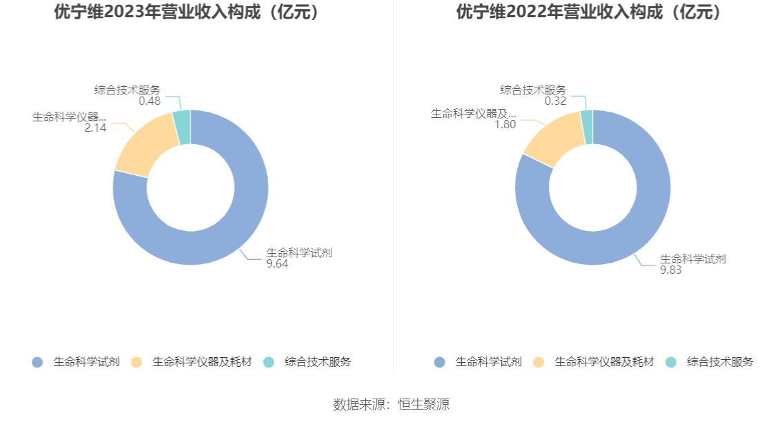 分产物来看,2023年公司主买卖务中,生命科学试剂收入9.64亿元,同比下跌1.95%,占买卖收入的78.60%;生命科学仪器及耗材收入2.14亿元,同比增长18.95%,占买卖收入的17.47%;轮廓时期行状收入0.48亿元,同比增长48.69%,占买卖收入的3.93%。