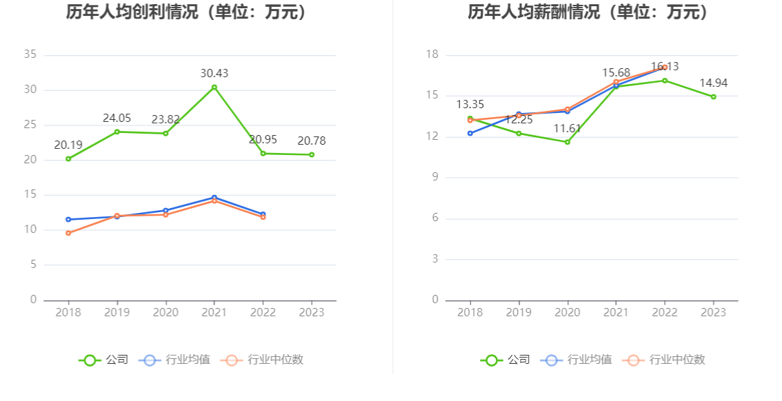 死心2023年末,公司职工总额为502东说念主,东说念主均创收98.75万元,东说念主均创利20.78万元,东说念主均薪酬14.94万元,较上年同时辰别变化0.79%、-0.83%、-7.41%。