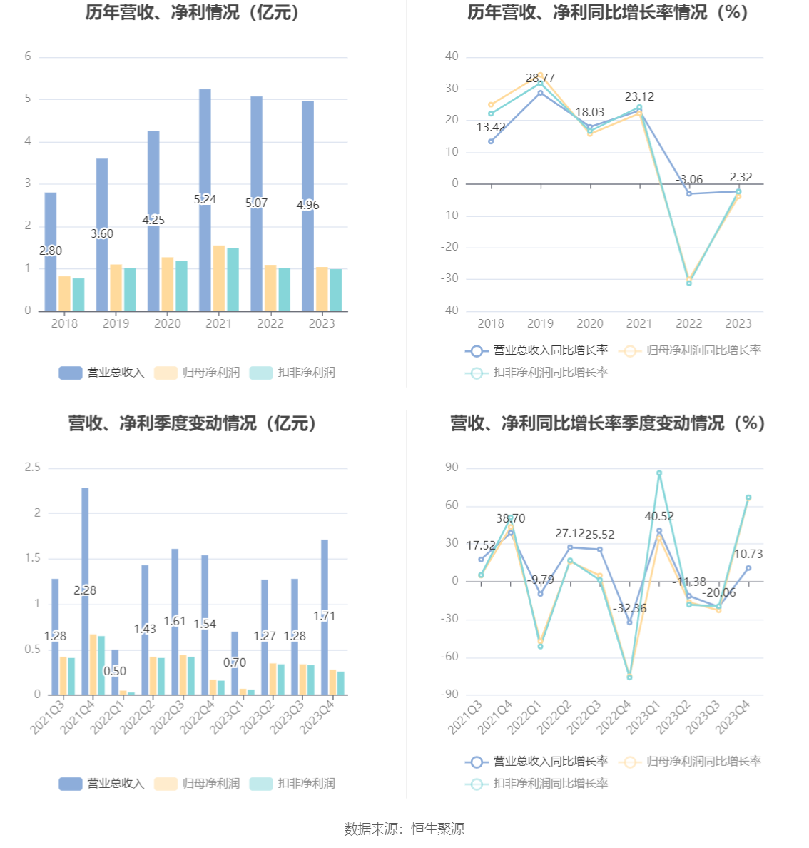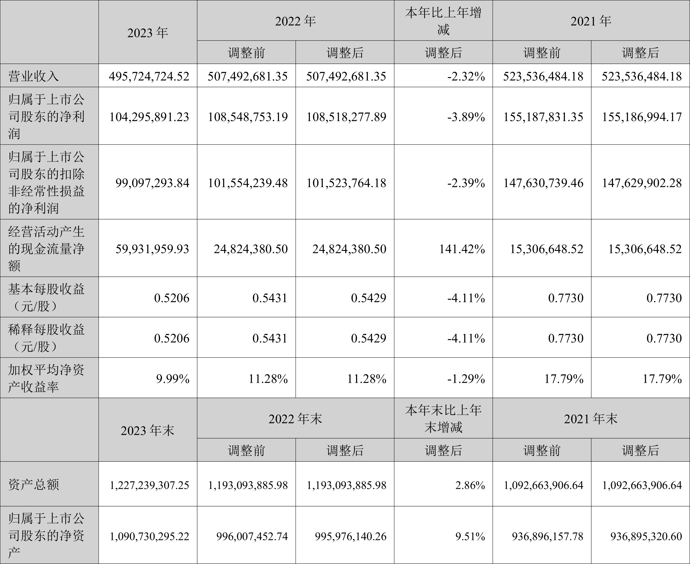 中证智能财讯汇中股份(300371)4月23日透露2023年年报。2023年,公司杀青生意总收入4.96亿元,同比下落2.32%;归母净利润1.04亿元,同比下落3.89%;扣非净利润9909.73万元,同比下落2.39%;规画算作产生的现款流量净额为5993.20万元,同比增长141.42%;讲演期内,汇中股份基本每股收益为0.5206元,加权平均净钞票收益率为9.99%。公司2023年年度利润分拨预案为:拟向全体激动每10股派1.6元(含税)。