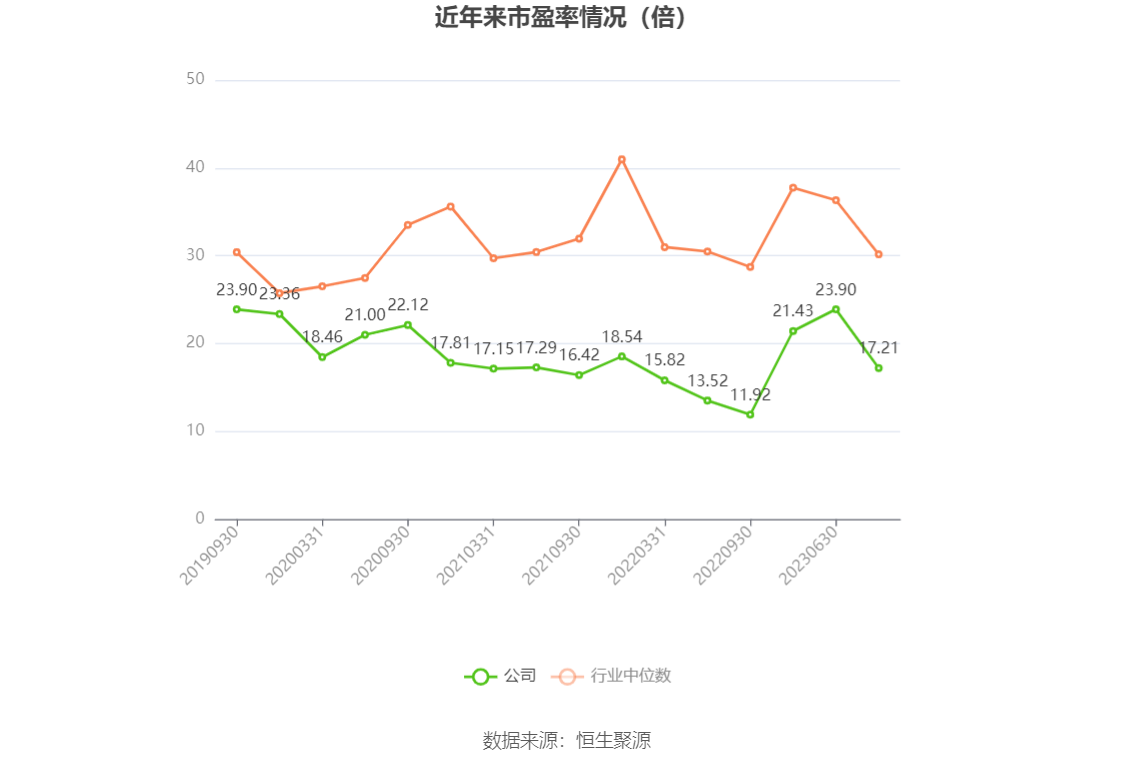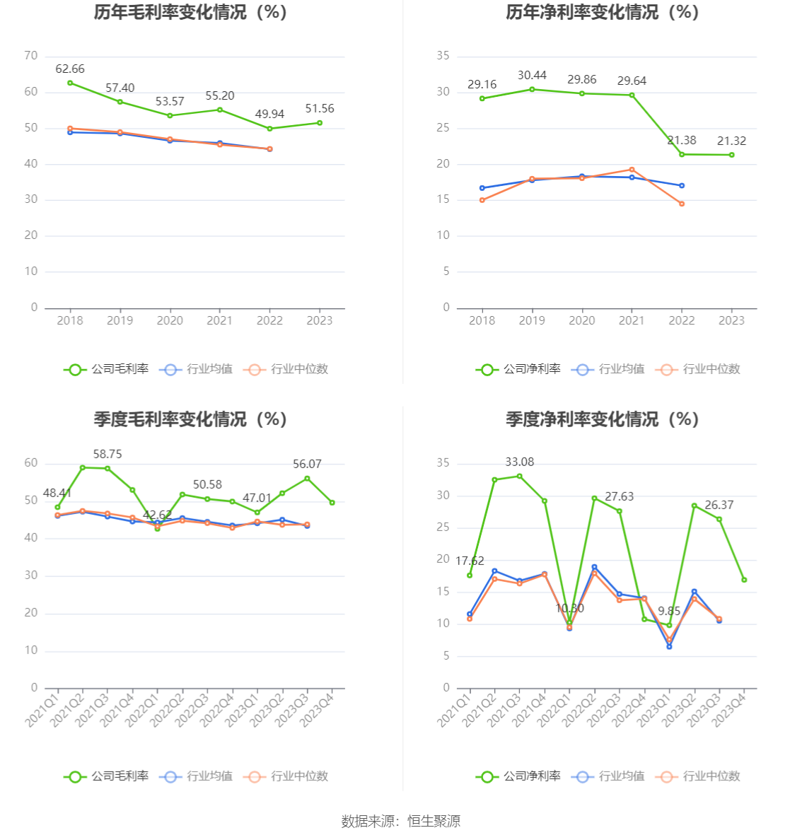 2023年,公司毛利率为51.56%,同比上涨1.62个百分点;净利率为21.32%,较上年同时下落0.06个百分点。从单季度观点来看,2023年第四季度公司毛利率为49.61%,同比下落0.32个百分点,环比下落6.46个百分点;净利率为16.92%,较上年同时上涨6.12个百分点,较上一季度下落9.45个百分点。
