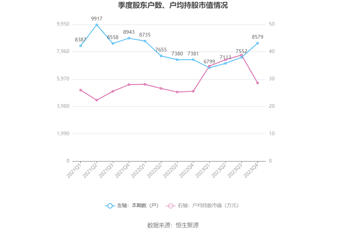 筹码聚合度方面,死心2023年年末,公司激动总户数为8579户,较三季度末增长了1027户,增幅13.60%;户均合手股市值由三季度末的38.79万元下落至28.59万元,降幅为26.30%。