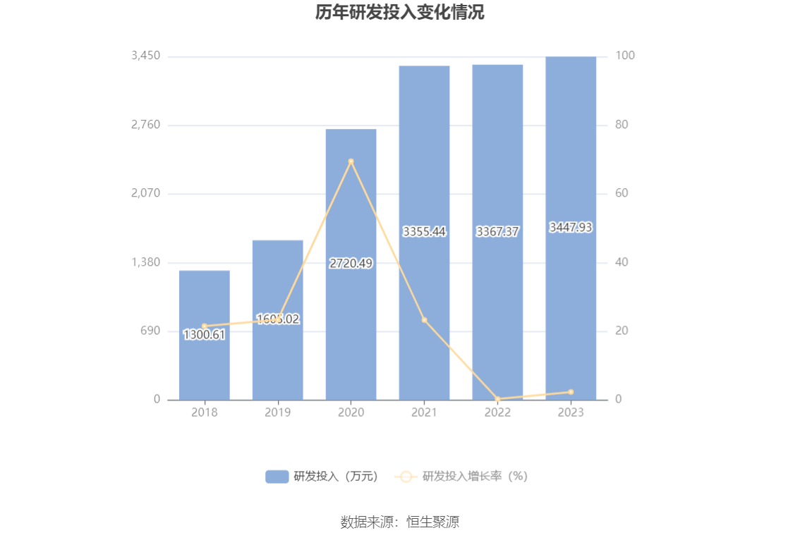 2023年全年,公司研发进入金额为3447.93万元,同比增长2.39%;研发进入占生意收入比例为6.96%,比较上年同时上涨0.32个百分点。此外,公司全年研发进入成本化率为0。