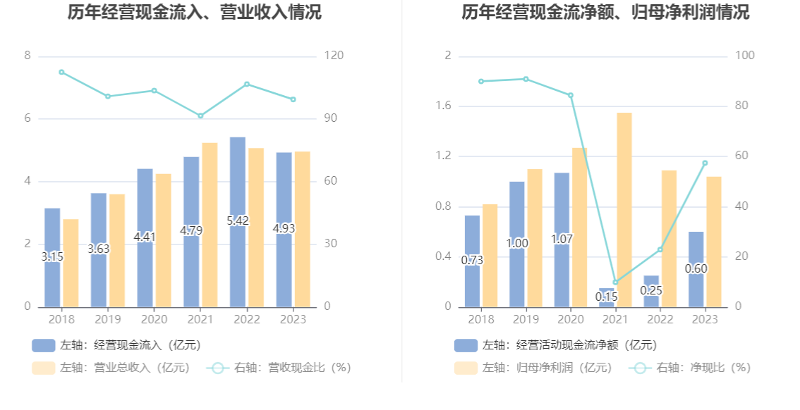 2023年,公司生意收入现款比为99.38%,净现比为57.46%。